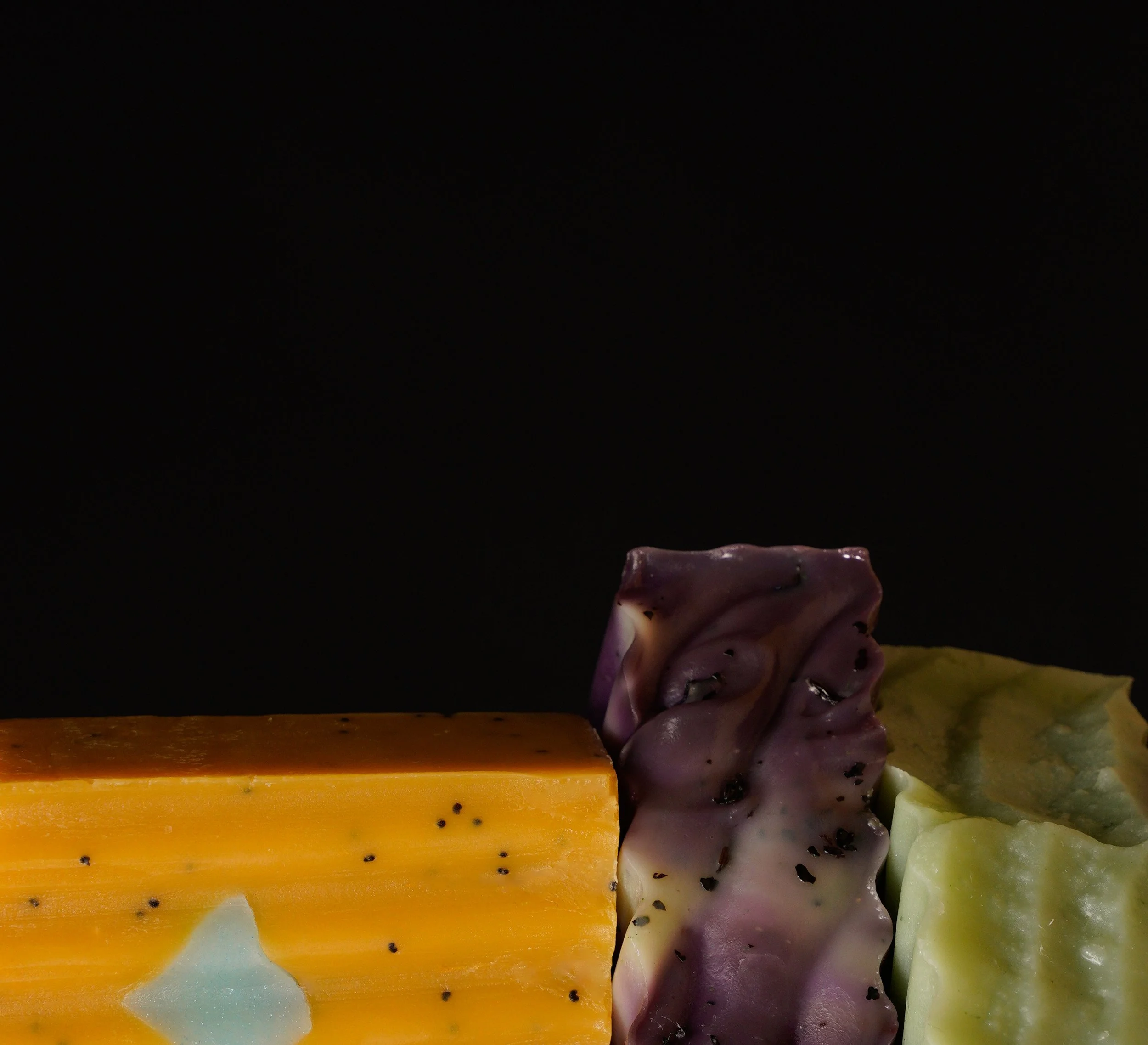 WHIFF GOODS products use natural ingredients wherever possible. That means for our soaps, we are using natural food grade oils, and plant based waxes and butters. Colorants all come either from the raw ingredients themselves, or natural colorants like colored micas, dried herbs and spices, activated charcoal, and other skin safe mineral pigments.